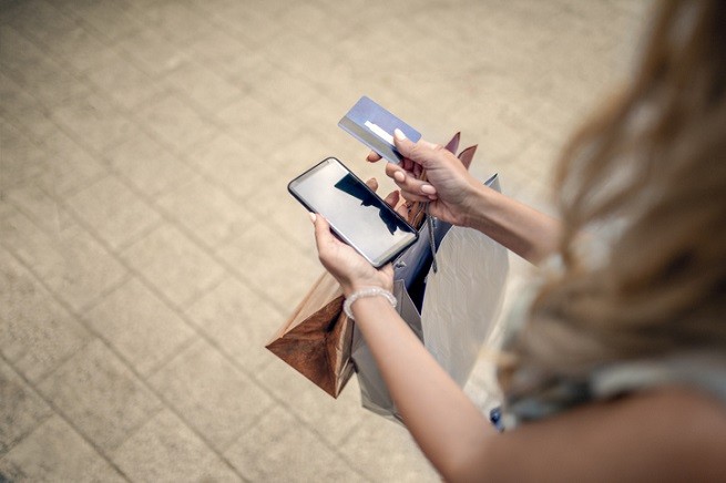 Girl in shopping. Blonde woman with shopping bags, credit card and phone. Hands holding credit card and mobile phone. Online shopping. Shopping, lifestyle concept.
