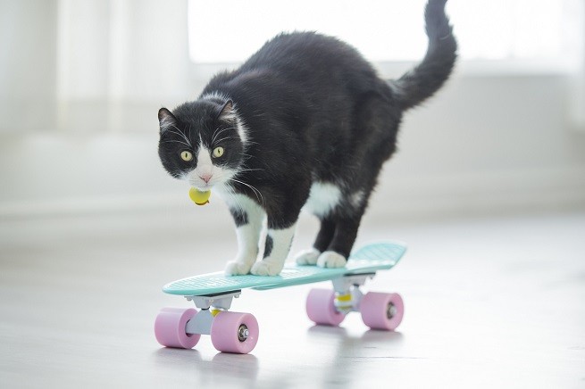Quirky scene of cute black and white domestic cat riding a pink and teal skateboard indoors in a bright white room in front of a window.
