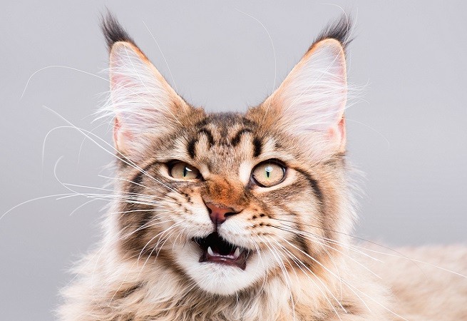 Portrait of domestic black tabby Maine Coon kitten - 5 months old. Cute striped kitty looking at camera. Beautiful young cat make funny face on grey background.