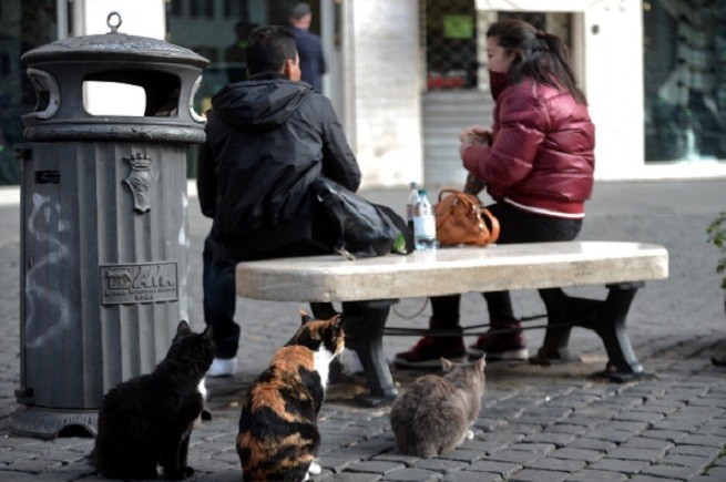 Stray cats look at tourists eating near the ancient Area Sacra ruins in Rome on October 30, 2012. Members of a self-funded non-profit group named "Feline Colony of Largo Argentina", who are dedicated to taking care of the several hundred cats which roam the Area Sacra ruins are worried about a decision by the Rome Department of Archeology to "clean-up" the ruins, fearing that the government institution is aiming to push out the stray cats. Attempting to ease the organization's concerns a representative from Rome's Department of Archeology said the clean-up was aimed primarily at construction that has infringed on the ruins, not at the cats which the 'Largo Argentina' organization consider a distinctive part of the area's identity and a draw for tourists. AFP PHOTO / Filippo MONTEFORTE (Photo credit should read FILIPPO MONTEFORTE/AFP/Getty Images)