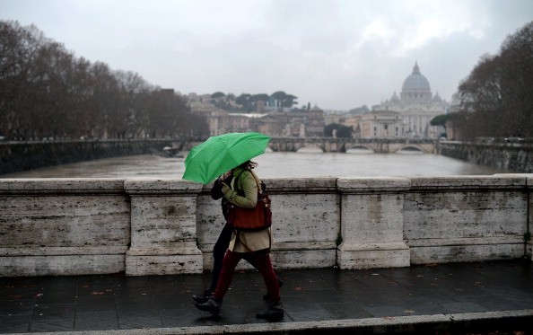 A couple walks on a bridge over the Tiber river by the Vatican, as the river's water level is rising following heavy rains in the region on February 1, 2014 in central Rome. AFP PHOTO / Filippo MONTEFORTE (Photo credit should read FILIPPO MONTEFORTE/AFP/Getty Images)