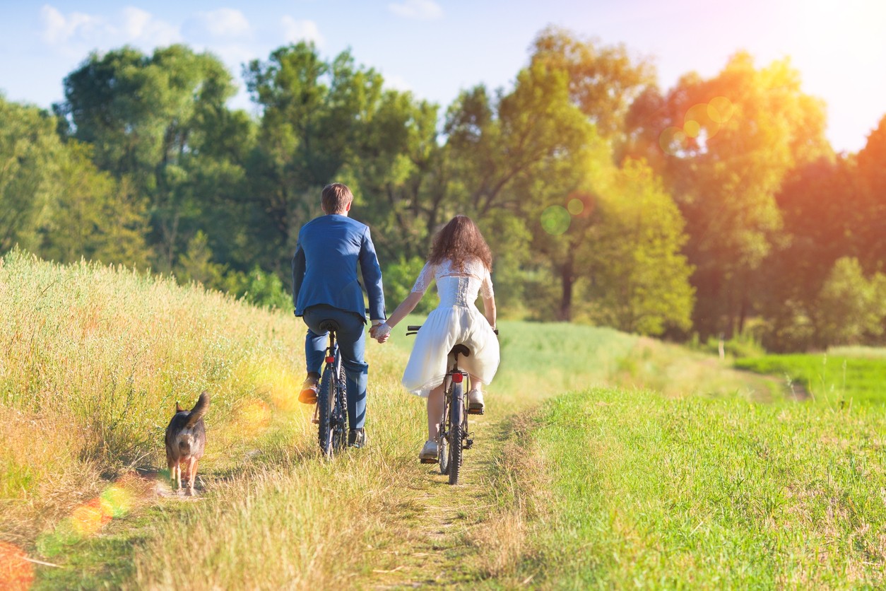 Young happy bride and groom ride bicycles in the meadow back to camera and holding hands.