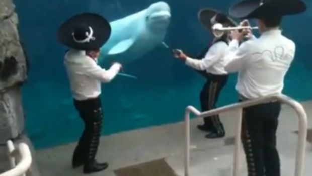 A una festa di matrimonio in un centro acquatico, la banda mariachi intrattiene un beluga