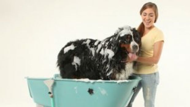 Una vasca per lavare il cane con tutti gli accessori per facilitare l'arduo compito