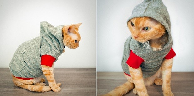 La felpa con cappuccio è un capo di abbigliamento che spopola soprattutto tra i giovani, per la sua comodità e il suo stile casual. Ci sono brand che propongono lo stesso mood anche nell'abbigliamento per gatti, anche se il felino protagonista della foto non sembra poi così convinto della scelta!