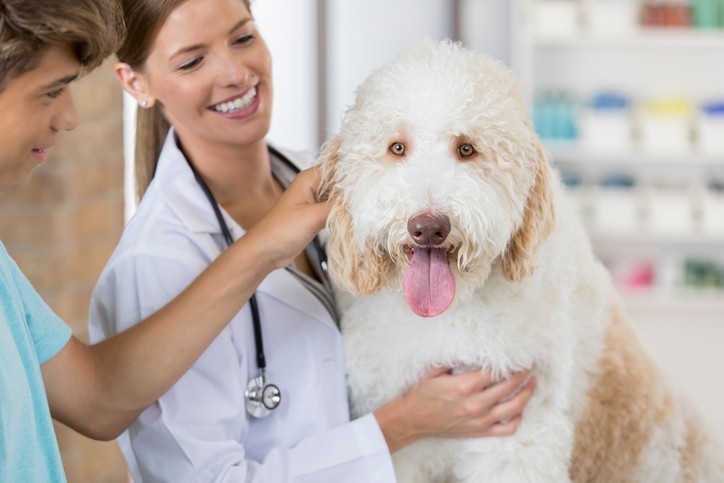 A large cream and apricot Labradoodle is panting and looking at the camera as he stands on an examination table at the vet. His teenage owner strokes his ear and speaks encouragingly as a mid adult female vet smiles and holds him.