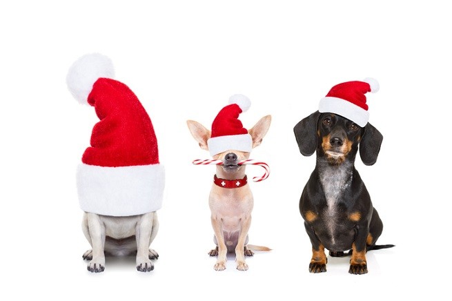christmas santa claus row of dogs isolated on white background, with funny red holidays hat and candy stick