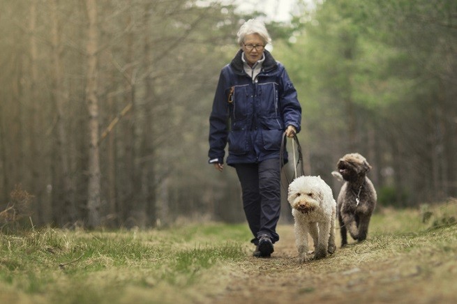 A retired woman out walking two dogs (Lagotto romagnolo) in a spring forest.