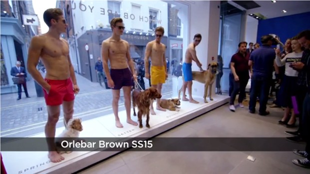 Il marchio britannico Orlebar Brown ha messo in vetrina degli uomini in costume per pubblicizzare la propria linea. Idea non nuova: modelli e modelle in carne e ossa sono presenti nelle vetrine di vari negozi e sono stati utilizzati da diversi marchi (come, per esempio, Dolce & Gabbana nel 2007 o Giorgio Armani nel 2008, sempre a Londra, per l’apertura di un suo punto vendita). Orlebar Brown, però, è andato oltre e, per pubblicizzare la propria collezione primavera/estate 2015, insieme ai modelli ha messo in vetrina quattro cani: se non erro sono un setter, un Cavalier King Charles Spaniel, un alano e un bulldog.