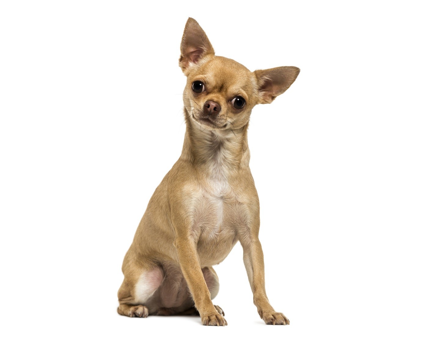 Chihuahua sitting, looking at the camera, 1,5 year old, isolated on white