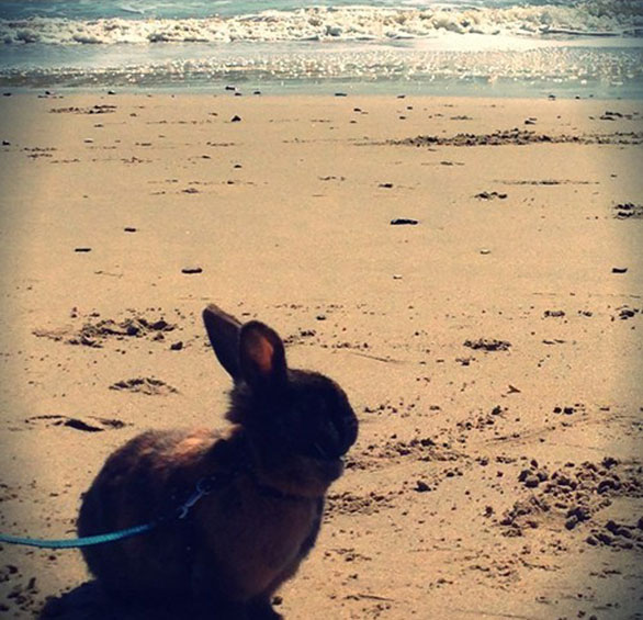 Questo coniglio gigante si chiama Heidi ed ha quattro anni. Si trova in piscina perché ha una forma di artrite su tutte e quattro le zampe e deve, immagino, irrobustire la muscolatura senza caricare troppo sulle articolazioni.