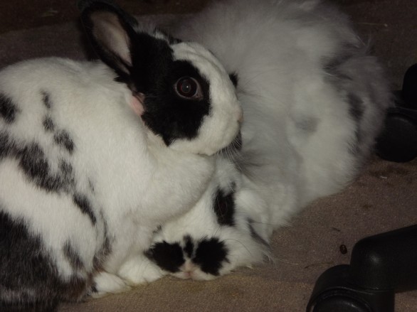 Prima di tutto la cosa più sbagliata è buttare direttamente il secondo coniglio in pieno territorio del primo: lì sono sicuramente botte da orbi! Dipendentemente dall’età e dal carattere dei conigli( inserire un cucciolo è cosa molto più semplice rispetto ad un coniglio adulto) è bene seguire una certa procedura. Il primo punto è trovare un territorio neutro, che nessuno dei due conigli ha mai visto. Vediamo prima il caso più facile: coniglio adulto+cucciola. In genere è sufficiente portare i due in territorio neutro, dotato di vie di fuga( MAI un posto piccolo o pericoloso, e men che meno una gabbia!), mettere a terra abbondante cibo e premietti, e provare l’incontro tenendosi ovviamente pronti alla divisione. Solitamente il tutto funziona in breve tempo. Naturalmente devono stabilire la gerarchia che, in caso di un cucciolo, è praticamente cosa scontata.