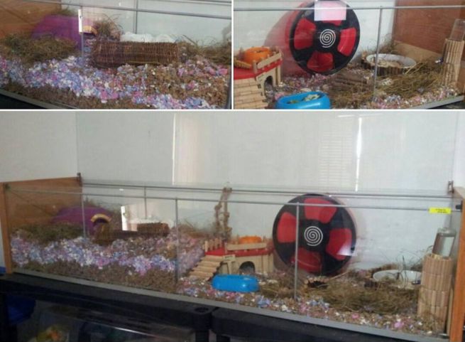 Sembra dal video che con una buona organizzazione e una palettina di dimensione adeguata pulire un terrario sia uno scherzetto. In effetti non è una cosa così complessa, ma non ci si mette nemmeno pochissimo. E’ bene se il fondo del terrario, una volta svuotato, viene passato con un panno e disinfettato con prodotti come aceto o amuchina, bisogna poi attendere che il tutto asciughi bene e poi si può nuovamente mettere un bello strato di lettiera o, meglio ancora, di due lettiere combinate così che i tunnel scavati dal criceto reggano meglio (canapa e cellulosa sono ottimali). Chiaramente gli oggetti vengono lavati e ci vuole tempo perchè asciughino. Ovviamente una volta “presa la mano” con le pulizie i tempi si riducono, ma credo che meno di un’oretta non sia sufficiente per pulire e disinfettare il tutto: c’è da dire che non è una operazione da ripetere così frequentemente poichè un terrario così grandicello necessita un cambio completo una volta al mese.