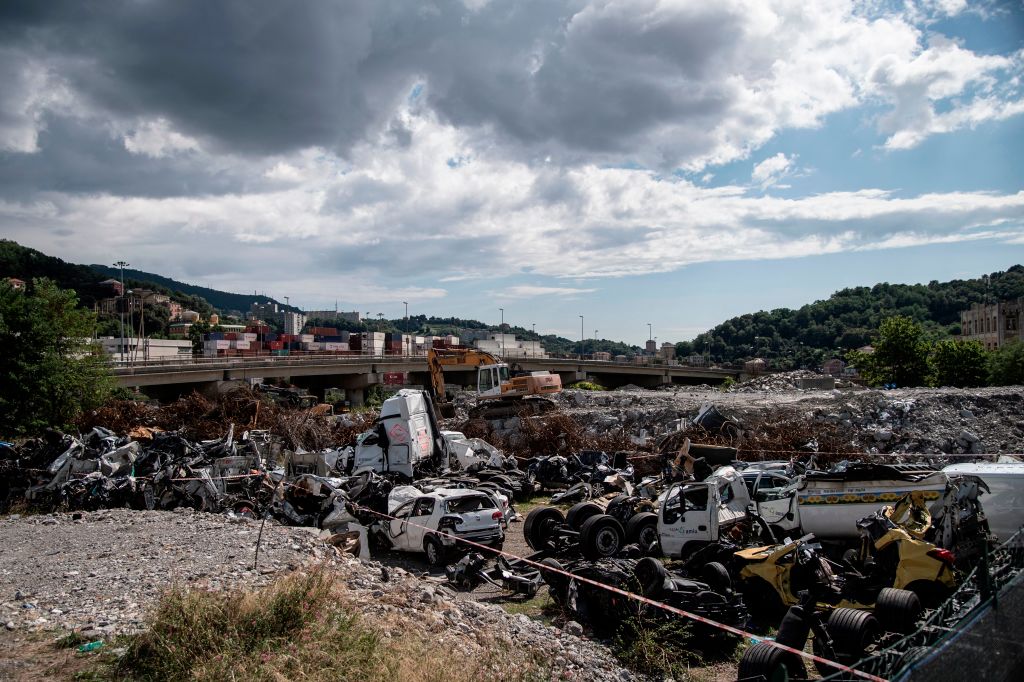 A picture shows wreckages of vehicles involved in the Morandi motorway bridge collapse at an impound area in Bolzaneto near Genoa on September 2, 2018. - The giant motorway bridge collapsed on August 14, 2018 killing 43 people. The collapse, which saw a vast stretch of the A10 freeway tumble on to railway lines in the northern port city, was the deadliest bridge failure in Italy for years. (Photo by MARCO BERTORELLO / AFP) (Photo credit should read MARCO BERTORELLO/AFP/Getty Images)