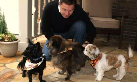 In this Nov. 23, 2014 photo provided by Jan Trantham, Will Trantham kneels by Jackson, left, a Shih Tzu, along with Darcy, center, and Sophie. Trantham and his wife adopted Jackson when they checked into Aloft Hotel in downtown Asheville, N.C., that is believed to be the only hotel in the United States where guests can adopt the front desk dog. (AP Photo/Jan Trantham)