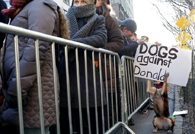 NEW YORK - FEBRUARY 04: Bindi, a Kelpie dog, jumps up toward a sign reading "Dogs against Donald" at an LGBT Solidarity Rally in protest of the Donald Trump Administration in front of Stonewall Inn on February 04, 2017 in New York City. (Photo by Yana Paskova/Getty Images)