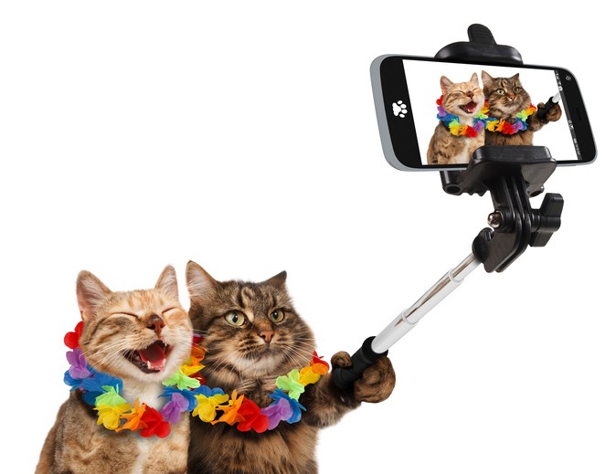 Funny cats are going on vacation. Funny cats - Selfie picture. Selfie stick in his hand. Funny cats are taking a selfie with smartphone camera. Selfie party.