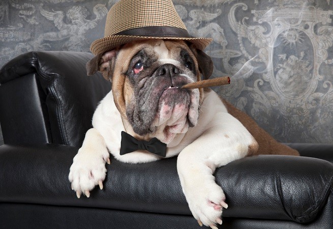 Portrait of English Bulldog resting in a black leather chair with a cigar .