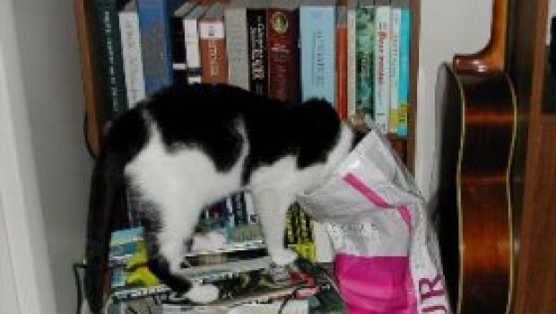 Al terzo piattino di croccantini mi sono resa conto che non poteva più trattarsi di fame: a ben guardare, il micetto è bello in carne, e credo che visiti senza vergogna il desco di più di una famiglia. Quello che mi impressiona è il suo modo di mangiare: sembra si tratti sempre del primo pasto dopo un mese di digiuno e dell’ultimo prima di tre mesi di carestia.