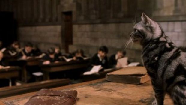 Per quel che riguarda i gatti, ne ricordo tre (anche se sarebbe meglio dire due e mezzo). Il primo è Grattastinchi, il gatto di Hermione. È un incrocio con un kneazle (creatura magica simile al gatto) e tra i suoi antenati ci sono senza dubbio dei persiani. È rossiccio, ha le zampe storte, sembra molto malandato ed è spesso sonnacchioso (è un gatto, no?). C’è, poi, Mrs Purr, la gatta di Argus Gazza il custode di Hogwarts. Mrs Purr ha una dote particolare: dice a Gazza se qualche studente fa qualche danno alla scuola (e spesso pare vedere Harry Potter anche quando il maghetto è coperto dal mantello dell’invisibilità). Infine abbiamo il mezzo gatto, cioè la professoressa Minerva McGranitt che è professoressa di trasfigurazione. Essendo un animago può assumere le sembianze di un animale: e lei diventa uno splendido gatto grigio tigrato (in foto).