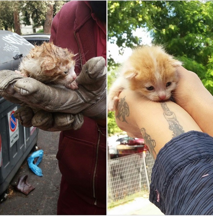Un piccolissimo gattino è stato trovato vivo tra i rifiuti, e fortunatamente è stato portato in salvo. A raccontarci questa storia, che non può che lasciarci esterrefatti di fronte alla crudeltà di certe persone che non hanno evidentemente alcun rispetto per la vita, è stato in questi giorni l’attore Cristian Di Sante, noto per aver partecipato a film come Spaghetti Story e Tulpa di Federico Zampaglione, che attraverso la sua pagina Facebook ha voluto denunciare il modo orribile in cui certi “esseri umani” si comportano nei confronti degli animali indifesi. Il piccolo micetto è stato infatti trovato in un cassonetto a piazza Jacini, nel quartiere Fleming, dove degli operatori dell’Ama hanno sentito fortunatamente i suoi miagolii, ed hanno cercato fra le buste della spazzatura, per fare poi una scoperta che li ha lasciati davvero senza parole.