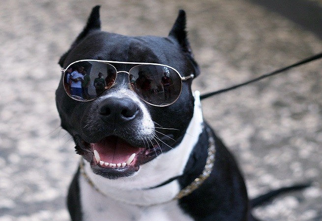 A Pit Bull wearing sunglasses is seen prior to the start of in Albania's first Dog Show in Tiranas Sport Palace on June 15, 2014. AFP PHOTO / GENT SHKULLAKU (Photo credit should read GENT SHKULLAKU/AFP/Getty Images)