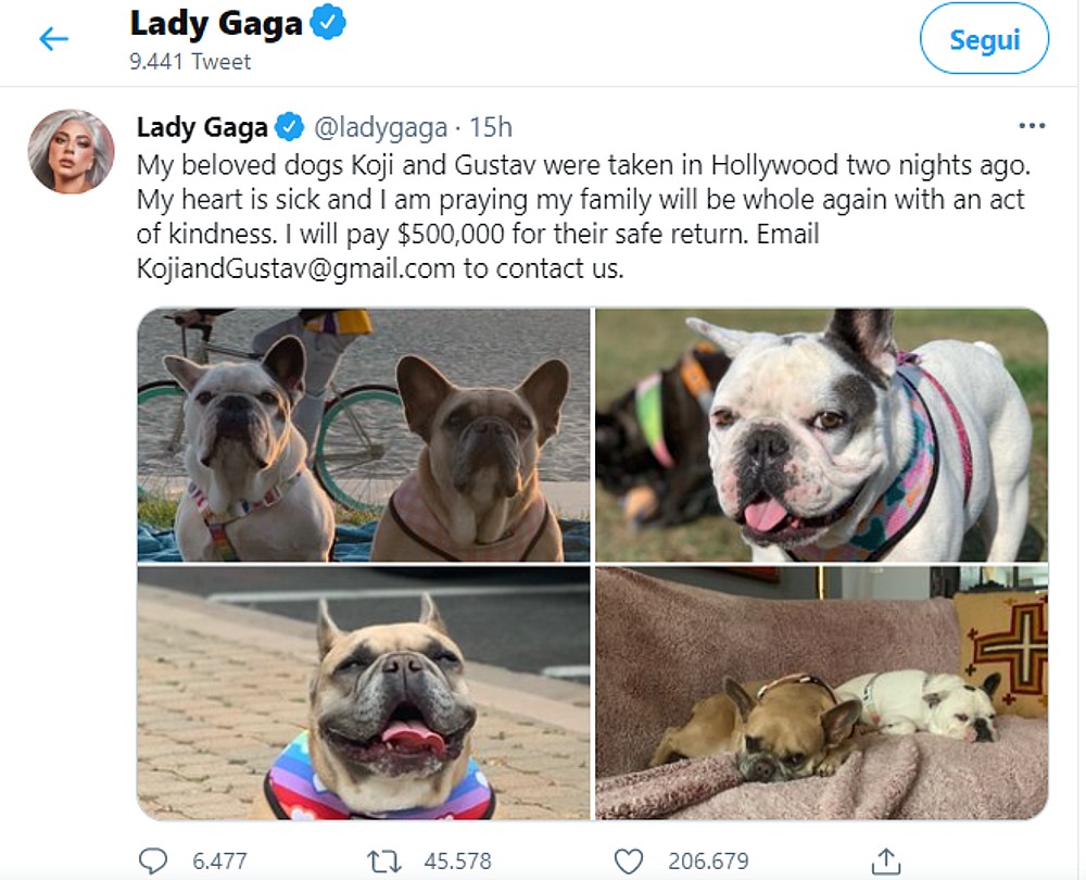 Per quanto riguarda il giovane Dog Sitter, sembra invece che le sue condizioni siano stabili ma ancora molto gravi. Secondo le autorità, il ragazzo sarebbe stato avvicinato da due malviventi mentre si apprestava a rientrare in casa dopo aver fatto una passeggiata insieme ai cani di Lady Gaga. Dopo aver cercato di rubare gli animali, i malviventi hanno sparato quattro colpi di pistola ed hanno rapito due dei tre cuccioli, Koji e Gustavo. La piccola Miss Asia è riuscita a scappare ed è stata prontamente rintracciata dalle forze dell’ordine e riconsegnata alle guardie del corpo della cantante.