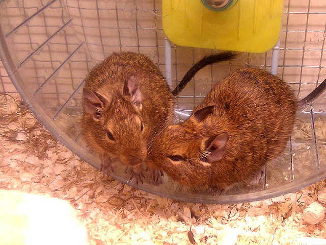 Come pet da compagnia, il degù può essere tranquillamente venduto nei negozi appositi senza obbligo di Cites o certificazioni, a parte lo scontrino fiscale, ma quello mi sembrava ovvio. Fondamentalmente è un animale molto vivace e divertente, non è complicato da allevare, è attivo anche di giorno ed è abbastanza silenzioso. Non va in letargo e rispetto ad altri roditori vive molto di più: se in natura la durata media della vita è di tre anni, in cattività potrebbe anche arrivare a dodici anni. Per contro, ha bisogno di una gabbia molto ampia e spaziosa: se pensate di prendere un degù e rinchiuderlo a vita in una di quelle minuscole gabbie da criceti, allora state sbagliando tutto. Non ama molto la solitudine, quindi se non prendete la coppia per evitare nidiate continue di degù, ricordatevi che dovete fargli molta compagnia e non abbandonarlo solo a se stesso per tutta la giornata. Inoltre se non viene educato bene da piccolo, da adulto può essere estremamente mordace.