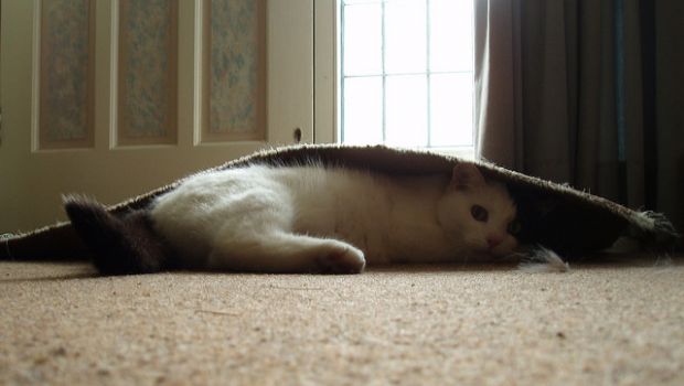 Avete presente quella fase in cui ogni bambino ha una spiccatissima possessività verso qualsiasi cosa? Quella fase in cui “mio!” è la parola più usata, quasi più di “mamma”? Beh, questa fase i gatti la passano per tutta la durata della loro vita. Se loro sono nel soggiorno di casa vostra, anzitutto quella è casa loro e, comunque, tutto quello che vedono è loro e quello che non vedono lo diventerà appena ci poseranno sopra i loro dolci occhietti. Questo micio ha adocchiato questo tappeto e, nonostante una porta di legno che lo ostacola, lui sa che quel tappeto è li che lo aspetta e prova senza sosta a riprenderselo!