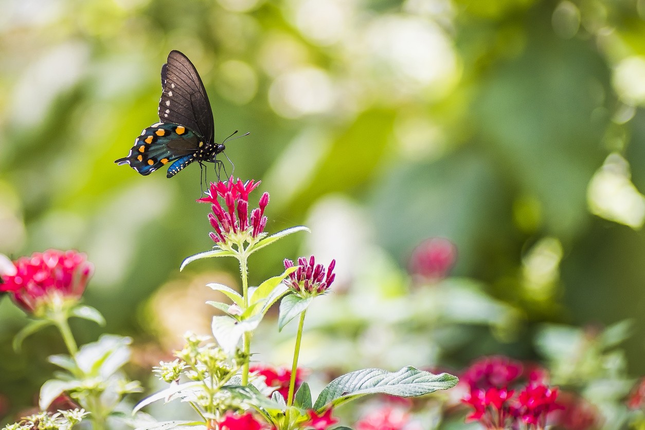 A swallowtail butterfly feeding on nectar on red flowers in Texas summer