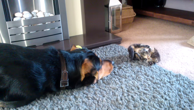 Il cane ha un atteggiamento propositivo ed aperto. Ovviamente non sa cos’è quella robina pelosa e semovente che gli si para davanti e lo scruta con attenzione. Il micio, di suo, non è molto interessato a fare amicizia e sembra voler chiarire subito le cose con una bella “zampata” sul naso del cane. Non ha ancora capito che il cane ha deciso di essere suo amico e che non potrà fare poi molto per fargli cambiare idea.