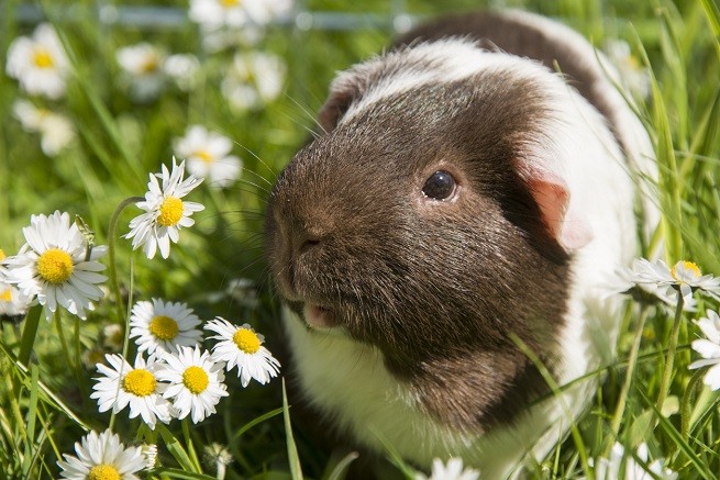 Guinea pig eating grass outside in the garden. Guinea pig (Cavia porcellus) is a popular household pet.
