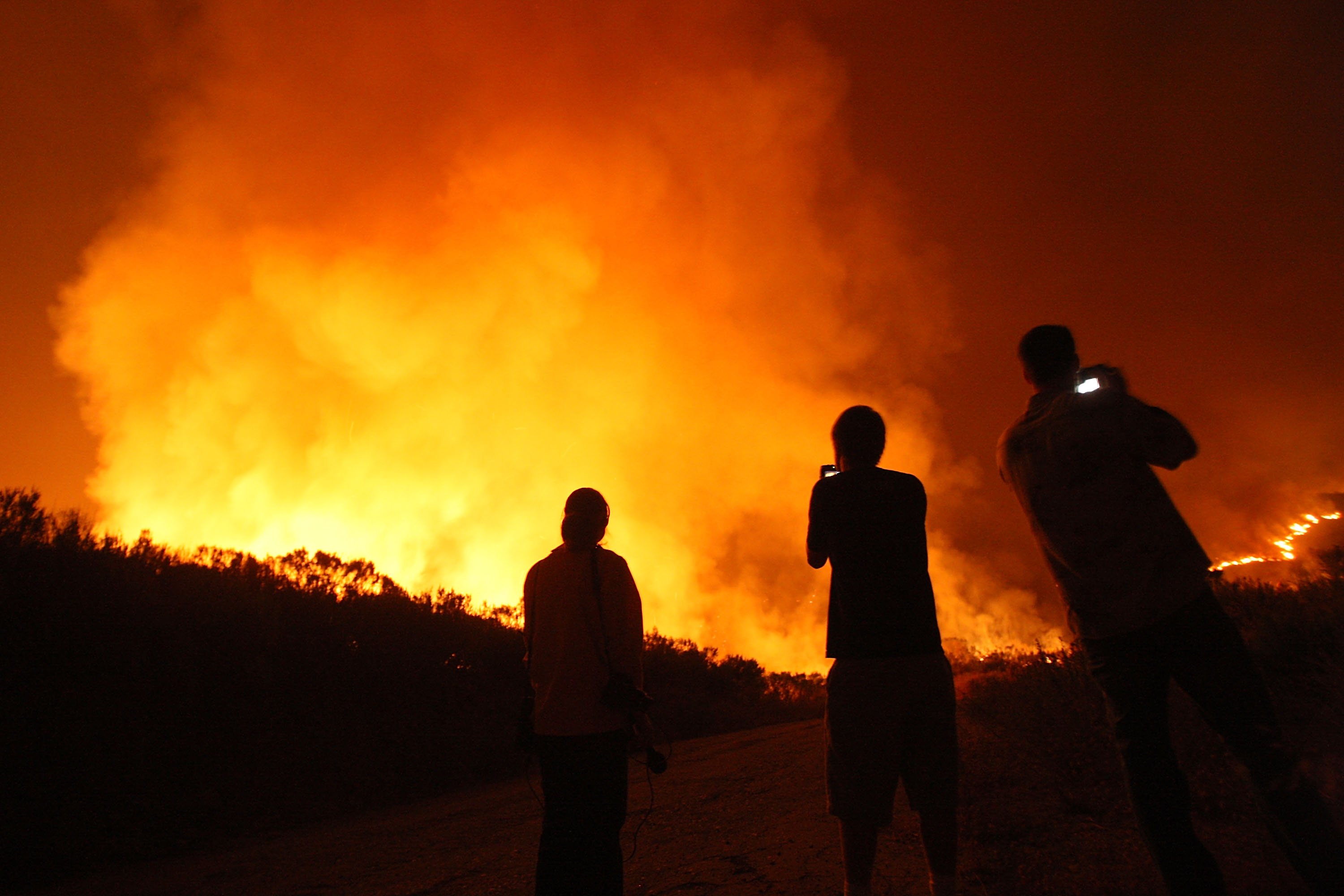MOORPARK, CA - SEPTEMBER 23: People photograph uncontrolled flames on the eastern flank of the 16,000-plus-acre Guiberson fire, burning out of control for a second day as Red Flag warnings continue in southern California on September 23, 2009 near Moorpark, California. A Red Flag warning means critical wildfire weather, based on a combination of high temperatures, low humidity and Santa Ana winds, is occurring. Several large wildfires broke out in triple-digit temperatures on the first of Red Flag warnings. (Photo by David McNew/Getty Images)