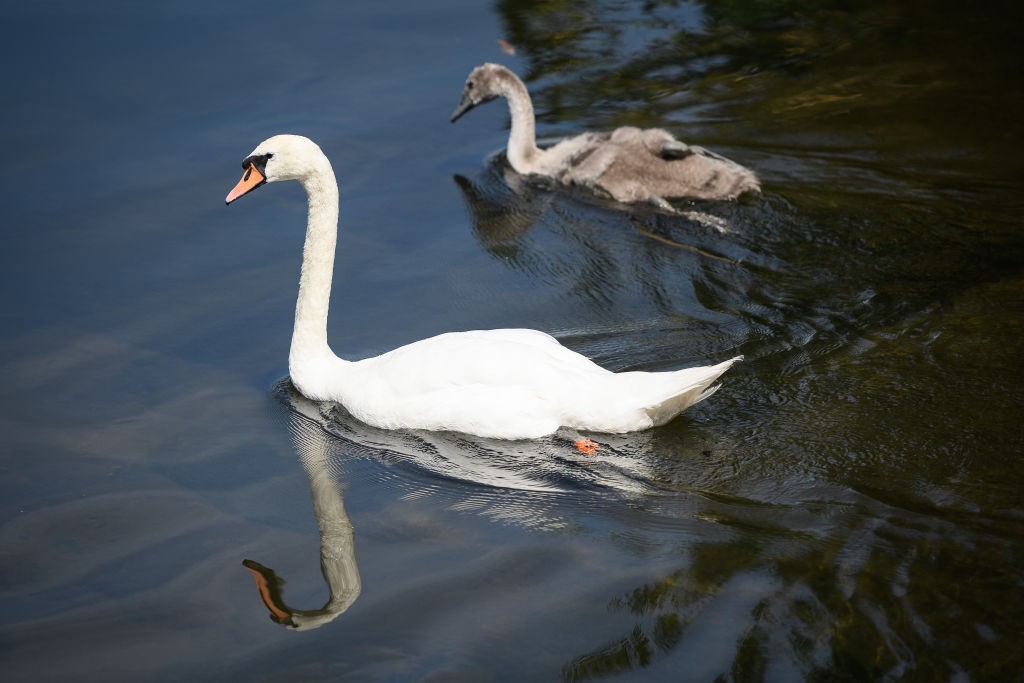 SHEPPERTON, ENGLAND - JULY 17: A swan and cygnet are seen during the annual Swan Upping census on July 17, 2017 on the River Thames, South West London. The historic Swan Upping ceremony dates back to the 12th century, to when the Crown claimed ownership of all Mute Swans and they were eaten at banquets and feasts. The Sovereign's Swan Marker, David Barber, counts the number of young cygnets on the river each year and ensures that the swan population is maintained. The swans and young cygnets are also assessed for any signs of injury or disease. (Photo by Leon Neal/Getty Images)