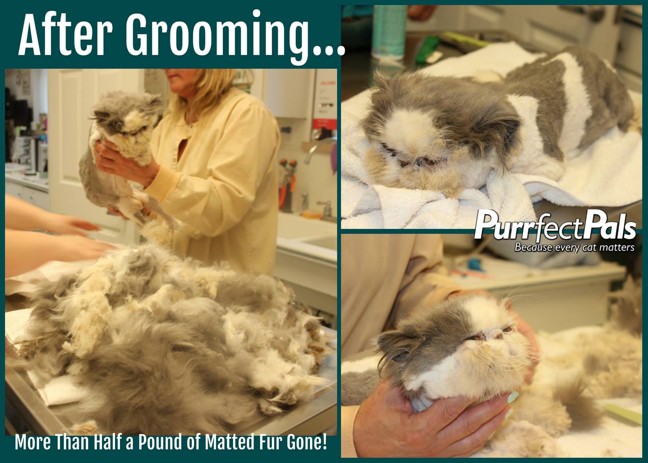 Gobo era molto timido quando è arrivato al Purrfect Pals, ma lo staff dell’organizzazione era determinato ad aiutarlo, e a fargli comprendere cosa voglia dire essere amati e coccolati. Ma prima di tutto, era necessario dare un bel taglio al lungo pelo del micione! Come potete vedere, il lavoro non è stato semplice! I volontari hanno rimosso quasi mezzo chilo di pelo dal povero gatto, ma il risultato è stato a dir poco stupefacente!