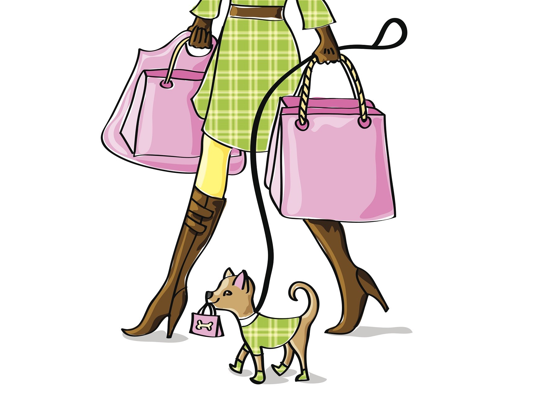 Woman walking with green plaid jacket, brown leather boots, shopping bags and her little dog whom is also wearing a green plaid jacket and carrying a little shopping bag