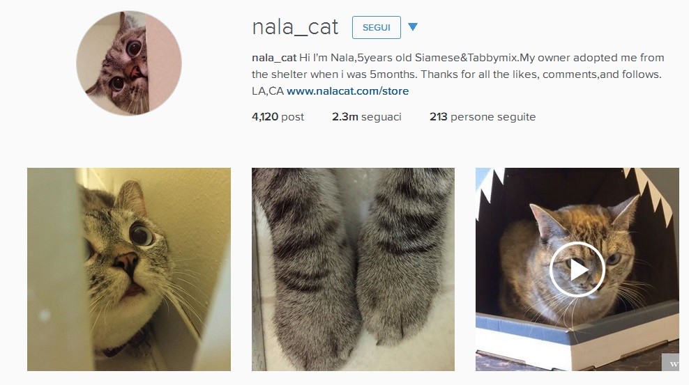 Nala su Instagram – Esiste un segreto per avere tanti follower su Instagram: dovete essere dei gatti. Vi presentiamo Nala, il gatto che sul suo account Instagram ha più di due milioni di follower (2.3 per la precisione). Se bazzicate su Instagram non sarete certo stupiti di sapere che certi gatti hanno il loro proprio account, anche su Facebook alcuni pet hanno ottenuto una loro Pagina. Pensate che un tempo Nala era una comunissima gatta proveniente da un rifugio, ma adesso grazie ai suoi proprietari è diventata una star su Instagram. Non avete ancora cliccato sul pulsante per seguire il suo account su Instagram? Sappiate che qui vi attendono, oltre ai 2.3 milioni di follower, anche 4.120 post e 213 persone seguite.