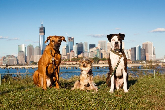 A pack of dog including Rhodesian Ridgeback, Chinese Crested, and Boxer sitting on the grass in Liberty State Park (Jersey City, NJ) and posing infront of the World Trade Center.