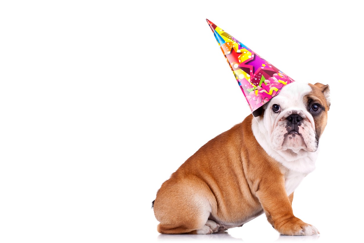side view of an english bulldog sitting and wearing a party hat with copy space