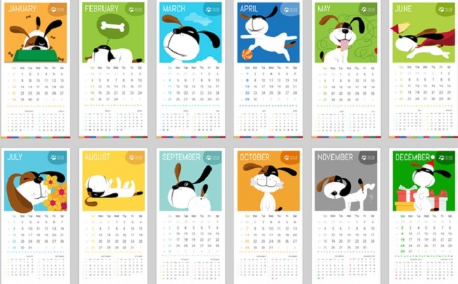 A vector 2018 complete Calendar illustrated with cute cartoon dogs with brilliant colors, with reference to the 2018 year of the dog in Chinese Zodiac.