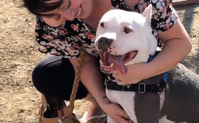 Proprio quel giorno, fra gli animali adottabili, la Best Friends Animal Society aveva scelto un cane di nome Butler, un Pitbull bianco e grigio che viveva al rifugio da due anni, in attesa di trovare una casa definitiva. E pensate che shock per i Frausto quando si sono resi conto che Butler era in realtà il loro Dodger perduto. Ovviamente la famiglia si è subito precipitata al rifugio di Best Friends a Los Angeles per riunirsi al loro cane.