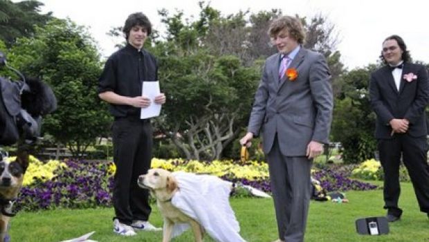 Il ragazzotto australiano che vedete nella foto ama davvero molto la sua cagnolina. Così tanto da ritenere quasi immorale una convivenza non regolarizzata. Ha perciò deciso di sposarla. Joseph e Honey sono convolati a giuste nozze davanti ad una trentina di amici. Joseph ha ritenuto opportuno specificare che il loro sarà un matrimonio molto casto. Chissà se in viaggio di nozze sono andati a trovare l’uomo che ha sposato il suo gatto. Di sicuro il genere di affettuosità che vivono le due coppie è diversa: ai gatti non piace baciare in bocca i loro padroni. Tutte le foto su River blog.