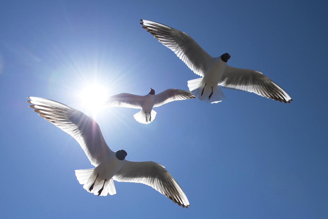 Three Black Headed Gulls flying together with backlit wings against the sun and a clear deep blue sky