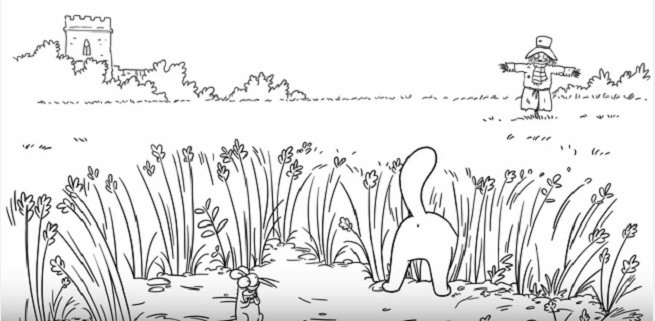 Il topo fugge, il micio se la prende con una mosca, si distrae con le rondini, rispunta fuori il grillo e quando finalmente lo acchiappa ecco che se lo fa fregare da una rondine. Ma improvvisamente nell’erba alta si muove qualcosa, il prode micio gli balza subito addosso, salvo fuggire quando scopre che si tratta di un volatile più grande di lui. Dopo aver sbattacchiato contro lo spaventapasseri e avergli fregato il cappello, torna fuori il tipo, il micio si spaventa e sobbalza, il cappello vola sul topo che comincia a spostarsi facendo muovere il cappello, il micio è terrorizzato da quel cappello che apparentemente si sposta da solo e scappa via. E il tipino fa spallucce perché non ha capito bene cosa sia successo.