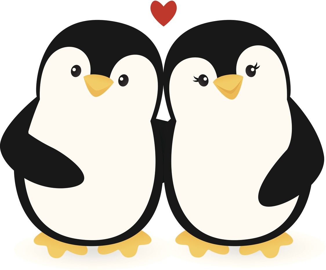 A vector illustration of a happy penguin couple. Penguins are grouped together on one layer. Linear and radial gradients used. No meshes.
