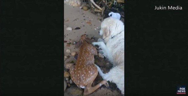 Cane salva cerbiatto – E’ Storm il nostro nuove eroe: il coraggioso cane ha salvato un cerbiatto che stava annegando. E’ successo tutto domenica sulle sponde di Long Island, New York. Storm e il suo proprietario Mark Freeley si trovavano sulle sponde di Long Island quando hanno visto questo cerbiatto in difficoltà nell’acqua. Ecco che allora Storm si è subito tuffato in acqua, ha nuotato verso il cerbiatto e, una volta raggiunto, lo ha afferrato delicatamente con la bocca per il collo in modo da riuscire a trascinarlo a riva. Arrivato qui, con il muso e le zampe Storm ha poi spinto il cerbiatto fuori dall’acqua sulla terraferma, accovacciandosi accanto a lui.