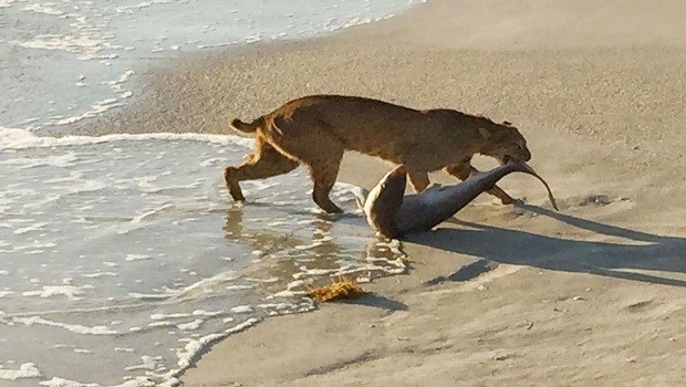 John Bailey si trovava a Vero Beach in Florida e stava camminando lungo il Sebastian Inlet State Park con in mano la macchina fotografica quando si è trovato di fronte ad una scenda tutt’altro che comune: una lince si è fiondata nell’oceano ed ha trascinato fuori uno squalo lungo più di tre metri fuori dall’acqua. Bailey ha fotografato l’azione sorprendendo e spaventando la lince che si è data alla fuga lasciando lo squalo sulla spiaggia.