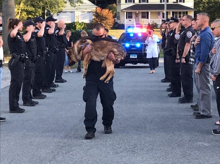 Per il nostro coraggioso amico, si è schierato l’intero dipartimento di polizia in picchetto d’onore, mentre il cagnolone veniva condotto presso la clinica veterinaria in braccio all’agente D’Aresta, con il quale ha condiviso vita e carriera.