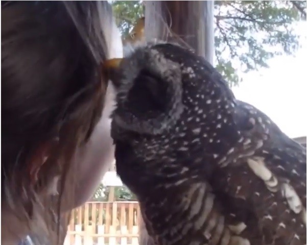 Il tenero momento delle coccole fra un gufo e la sua amica umana.