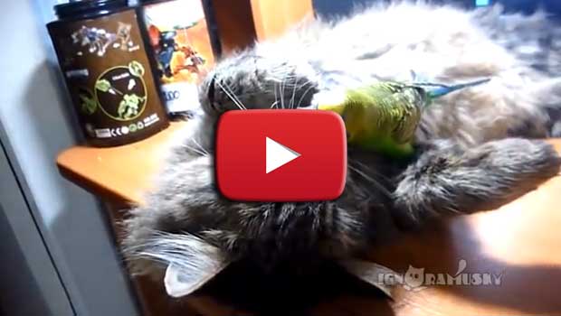 Uno strepitoso video ci mostra un pappagallino che, incurante del pericolo, zampetta addosso a un gatto che se ne sta sonnacchiosamente sdraiato.